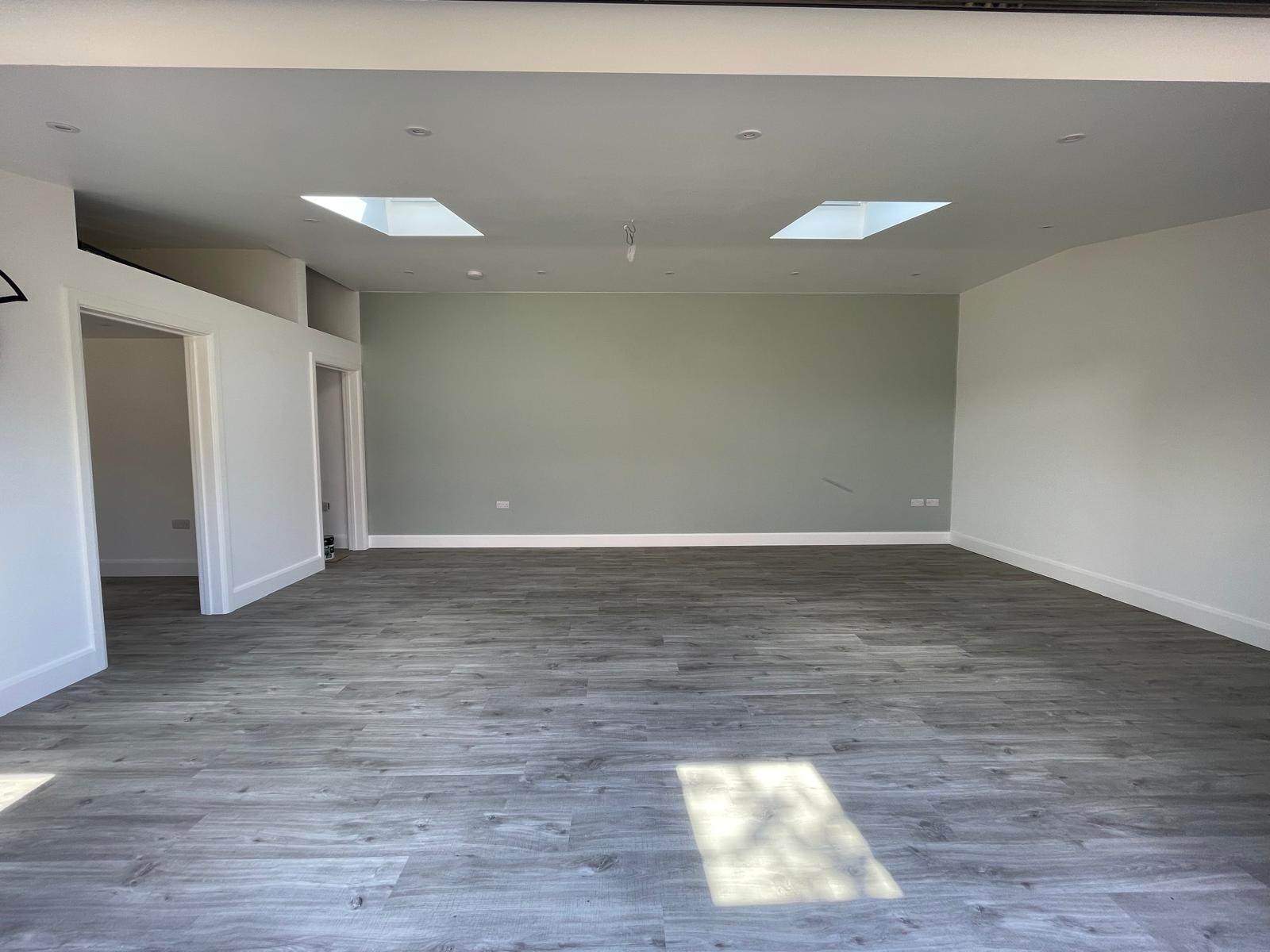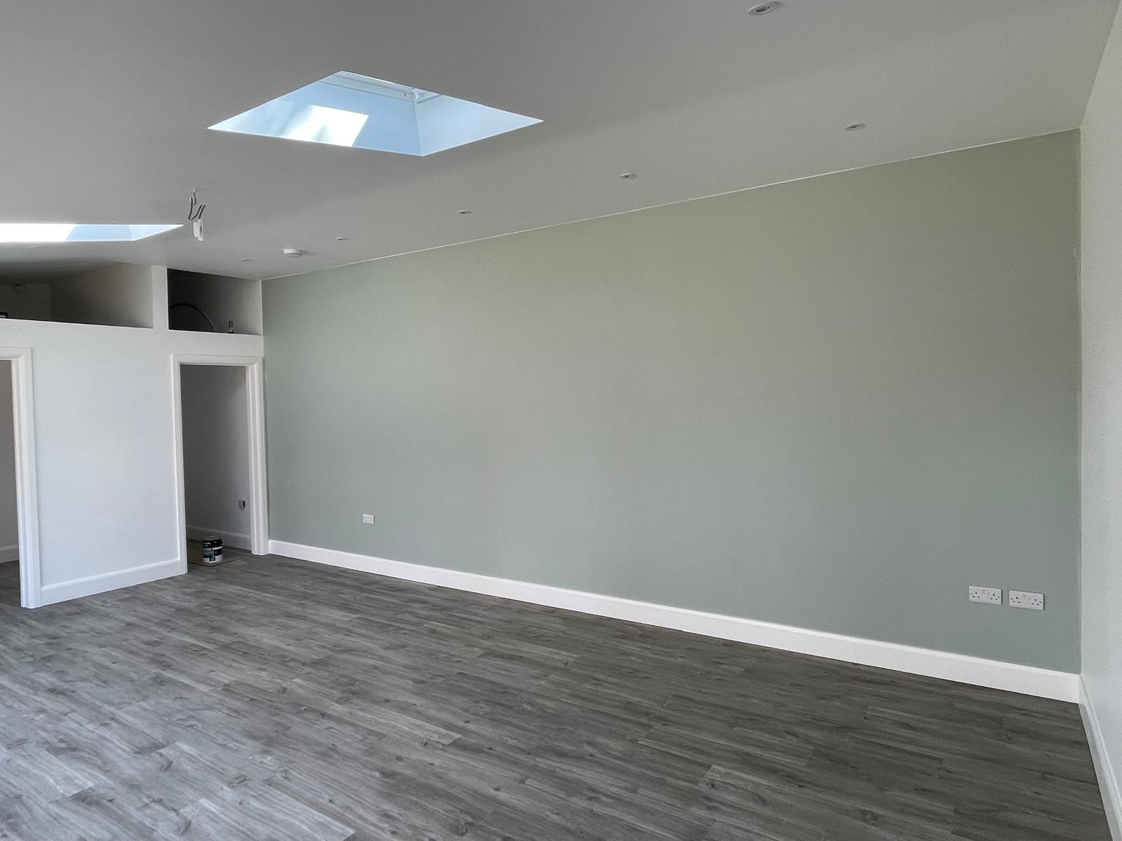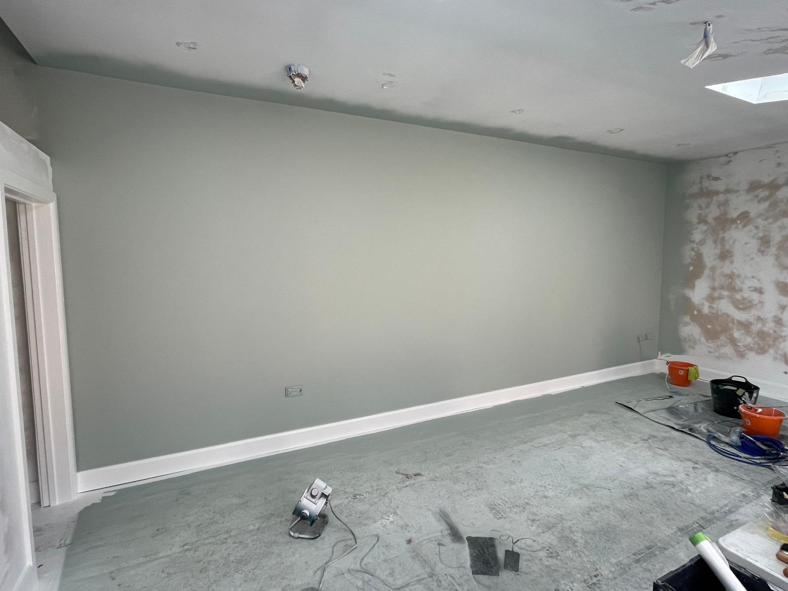 This outbuilding had freshly been plastered, prepared for us to finalise it with paint. Using professional masking and covering technique we was able to provide our customer with an accent wall with crisp edges.